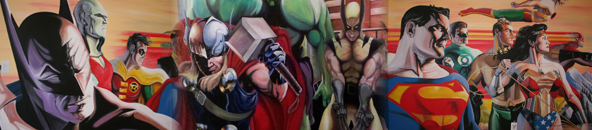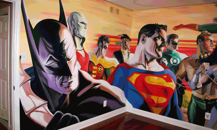 Full room mural featuring classic Super Hero characters from DC & Marvel comics. The mural covers all 4 walls & is done in the style of Alex Ross.