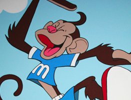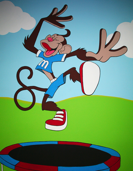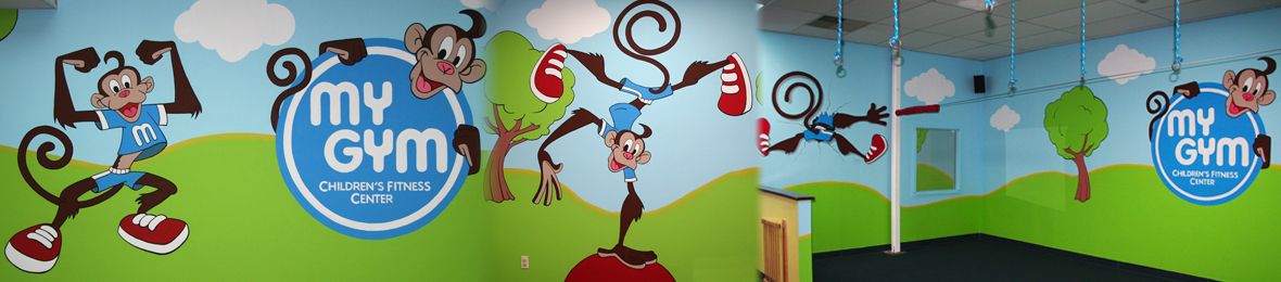 Full gym mural for the Children's Fitness Center in Cherry HIll, NJ. The mural features My Gym's mascot, Mymo in various poses around the entire gym.