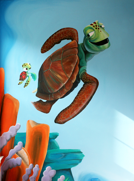 Full room mural featuring characters from Disney's Finding Nemo. The mural covers all 4 walls and is painted to give the impression that the room is sitting on the ocean floor.
