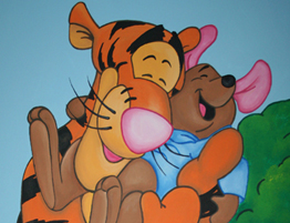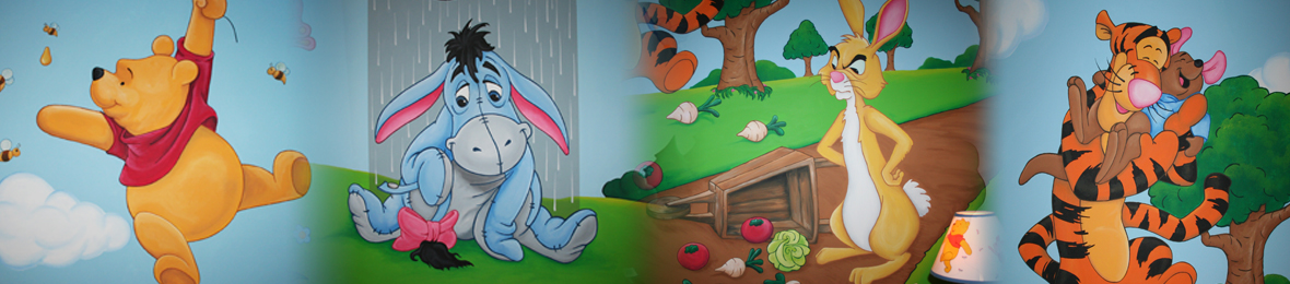 Full room mural featuring classic Winnie the Pooh characters. The mural covers all 4 walls of the room and the ceiling.