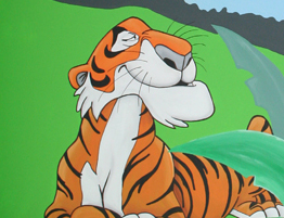 Full room mural featuring characters from Disney's Jungle Book & The Lion King. The mural covers all 4 wallls of the room and is painted to give the impression that the jungle trees are growing up trhough the ceiling.