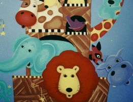 Full room mural painted to match the bedding of a child's nursery. The mural covers all 4 walls of the room and the ceiling.